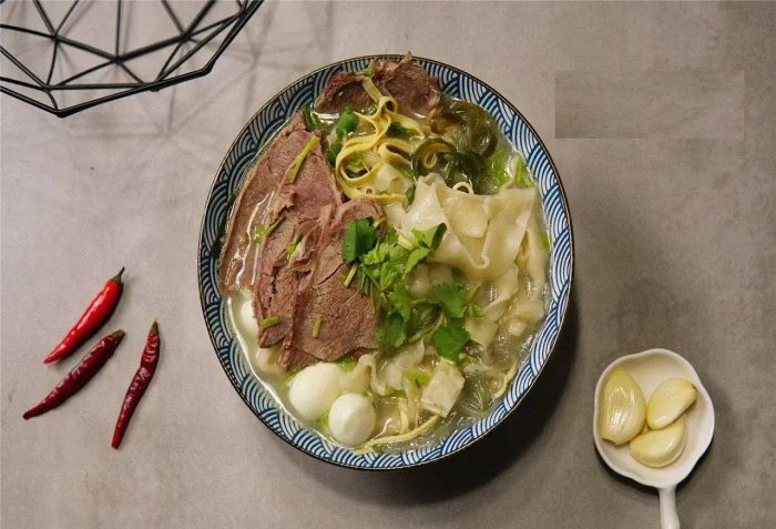 原阳烩面,素以“白汤”著称,即以羊大骨为主材,加水先用大火开锅,后用小火慢炖,熬出来的汤白白亮亮,犹如牛乳,故称“白汤”。面片则全是手工擀制,一把拽开甩动几下,下入滚开的汤锅里,三五分钟即可出锅盛碗,放入羊肉、撒上香菜、淋上几滴小磨香油,再佐以秘制辣椒,一口下去,酣畅淋漓。