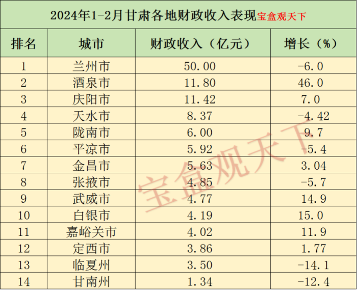 庆阳市(11.42亿)和酒泉市(11.80亿)两地财政收入均在11亿级别,位居全省前列。