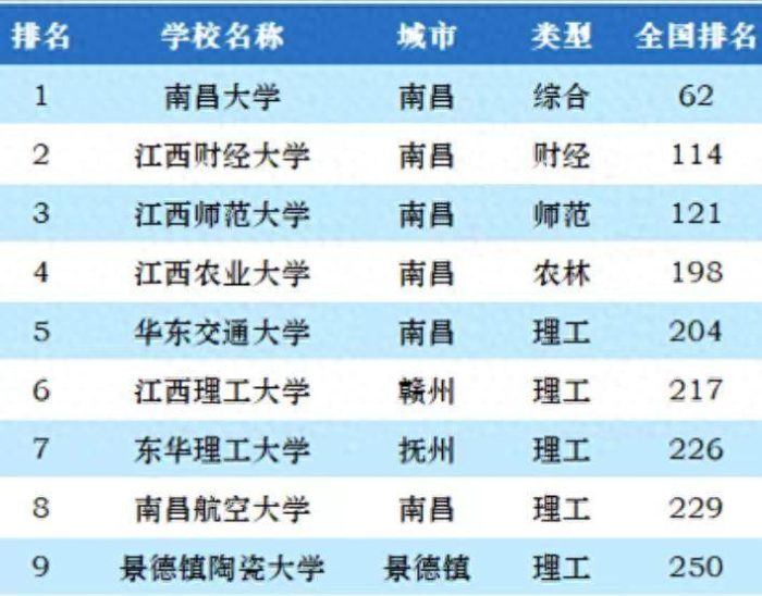 此外,居榜单前列的江西省高校还有江西农业大学、华东交通大学、江西理工大学、东华理工大学、南昌航空大学等,是考生报考江西省高校的优选。
