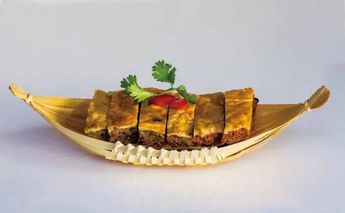 烧炙,外貌似油炸丸子,呈褐色,油亮。有一层当地人称为“猪网油”的东西包住,用碎猪肉、碎猪肝、葱白、冬笋等制成肉馅,经油爆或炭火炙烤过后香脆诱人。