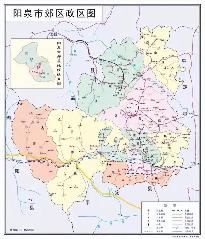 - 郊区,隶属于山西省阳泉市,位于山西省东部,太行山西麓。东、南与平定县相连,西与寿阳县毗邻,北与盂县交界,并且环抱阳泉市城区、矿区。汉,置上艾县。1969年,荫营区改称郊区。郊区出露地层由老至新有古生界奥陶系、石炭系、二叠系、中生界三叠系及新生界第四系。郊区地势西北高、东南低,全为山地丘陵地貌。郊区有桃河、温河两大季节性河流,均属海河水系,在平定县娘子关镇河滩村西汇合为绵河,水量季节分布差异大。郊区年均水资源总量1.43亿立方米,其中本地水资源量1.03亿立方米。辖区总面积512.93平方千米;郊区下辖3个镇、4个乡:荫营镇、河底镇、平坦镇、西南舁乡、杨家庄乡、李家庄乡、旧街乡;政府驻地江正大街1号。2022年,郊区常住人口27.59万人。2022年,郊区实现地区生产总值(GDP)172.97亿元。